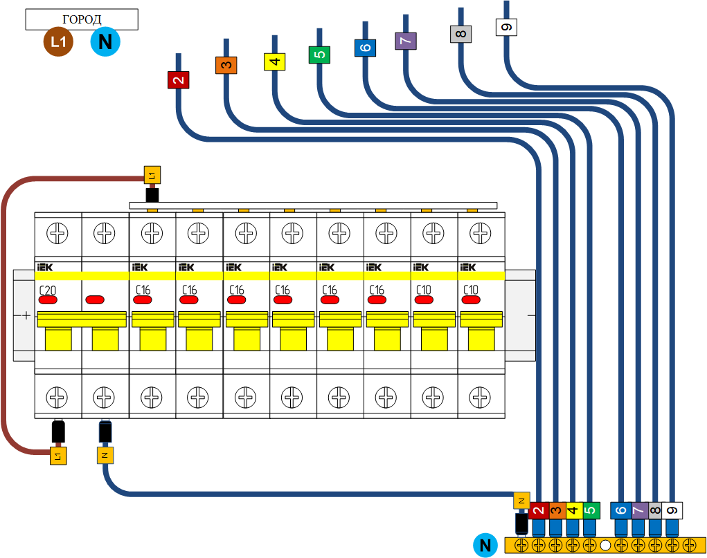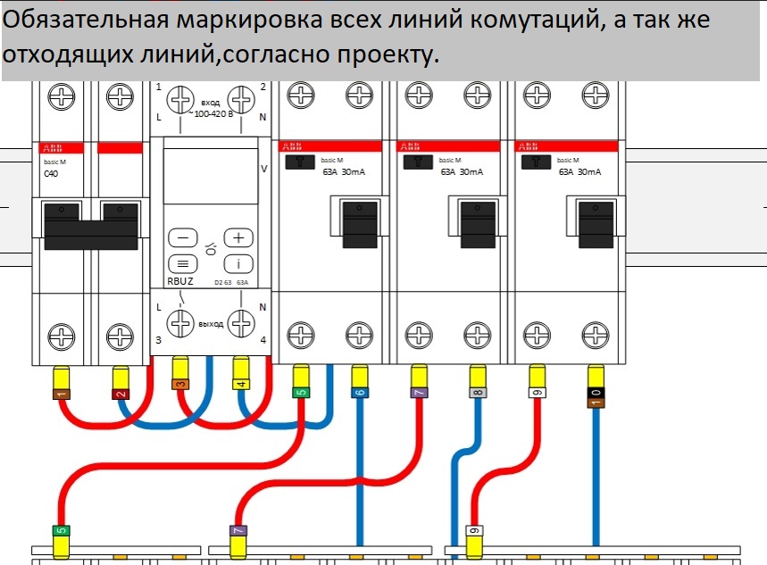Схема подключения, маркировка, указание принадлежности всех установленных аппаратов.